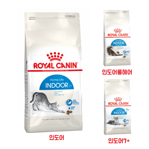 로얄캐닌 캣 인도어는 활동량이 적은 집고양이에게 맞추어 개발된 고품질 영양 건식사료입니다. 생후 12개월 이후 집고양이의 영양맞춤사료 인도어, 생후 7년 이후 노령묘의 영양에 맞춘 인도어7+,장모묘 헤어볼배출에 도움을 주는 인도어 롱헤어로 구분되어 있습니다.