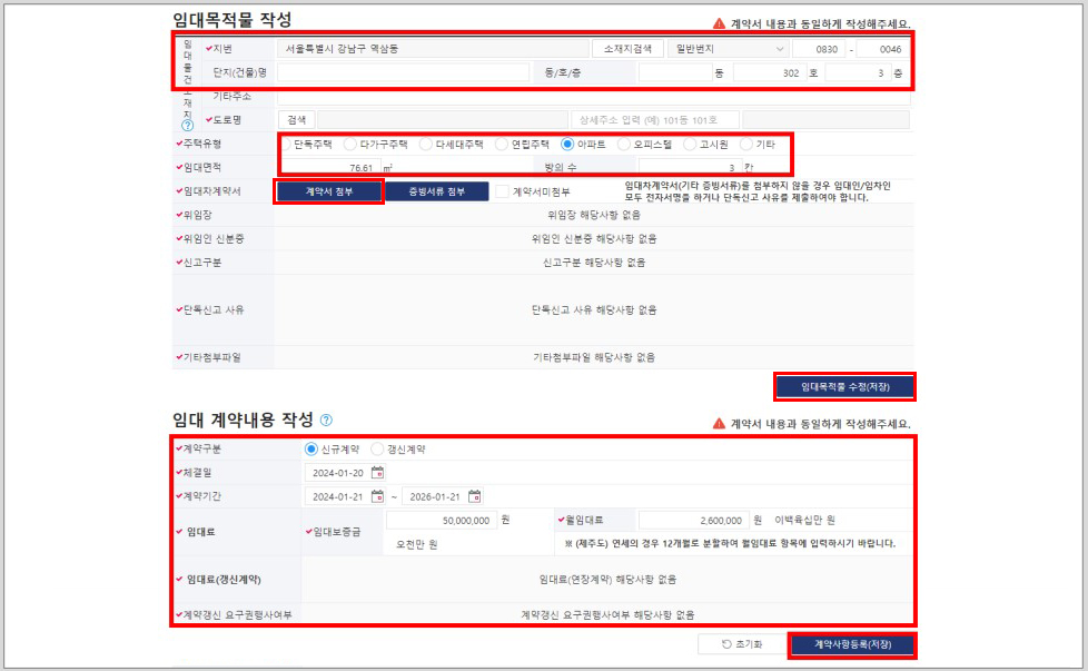 -임대 계약내용을 작성하고 [계약사항등록(저장)]을 클릭합니다.