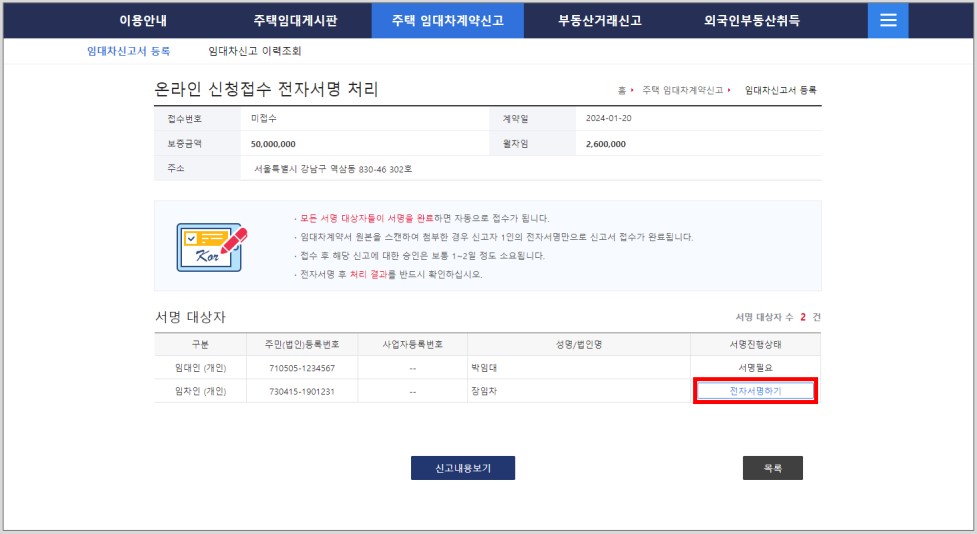-임대차계약서를 첨부했으므로 신청인(임차인) 본인만의 서명으로 신고가 접수완료됩니다.