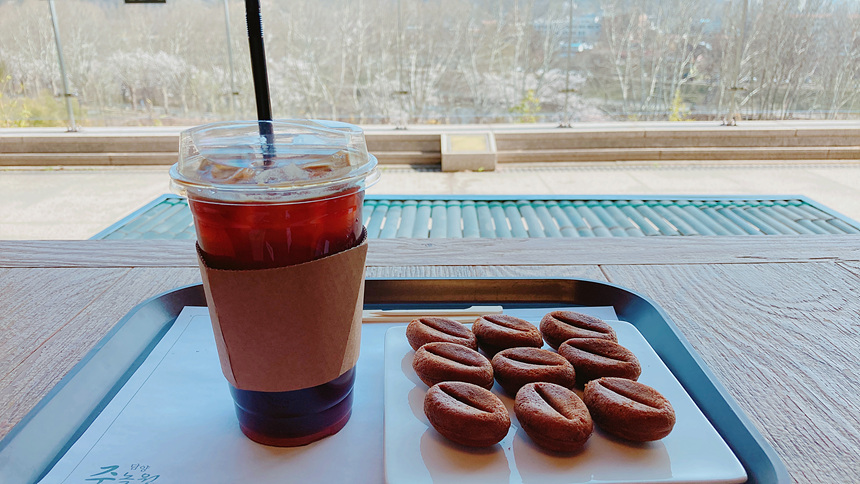 정문 쪽에서 기념품도 구경하고 잠시 지친 다리를 쉬어갈 겸 전망대가 있는 봉황루 카페에서 시원한 아이스 아메리카노를 마십니다. 사이드로 커피빵도 시켜보았는데 맛이 괜찮네요.^^