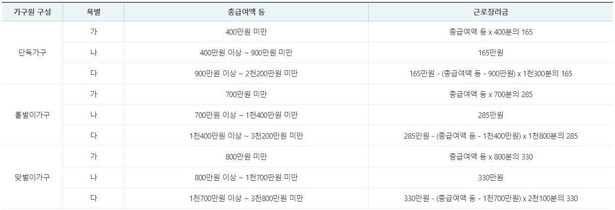 *근로장려금 지급액은 총 급여액 등에 의해 산정됩니다. 아래 표를 참고해 주세요.