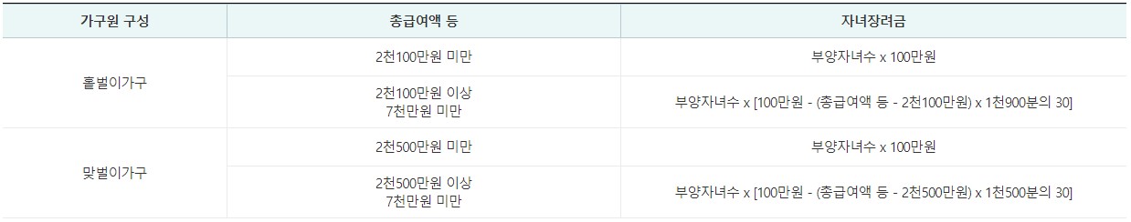 *연간 부부 합산 총 급여액 등을 기준으로 자녀 장려금이 산정됩니다. 아래 표를 참고해 주세요.