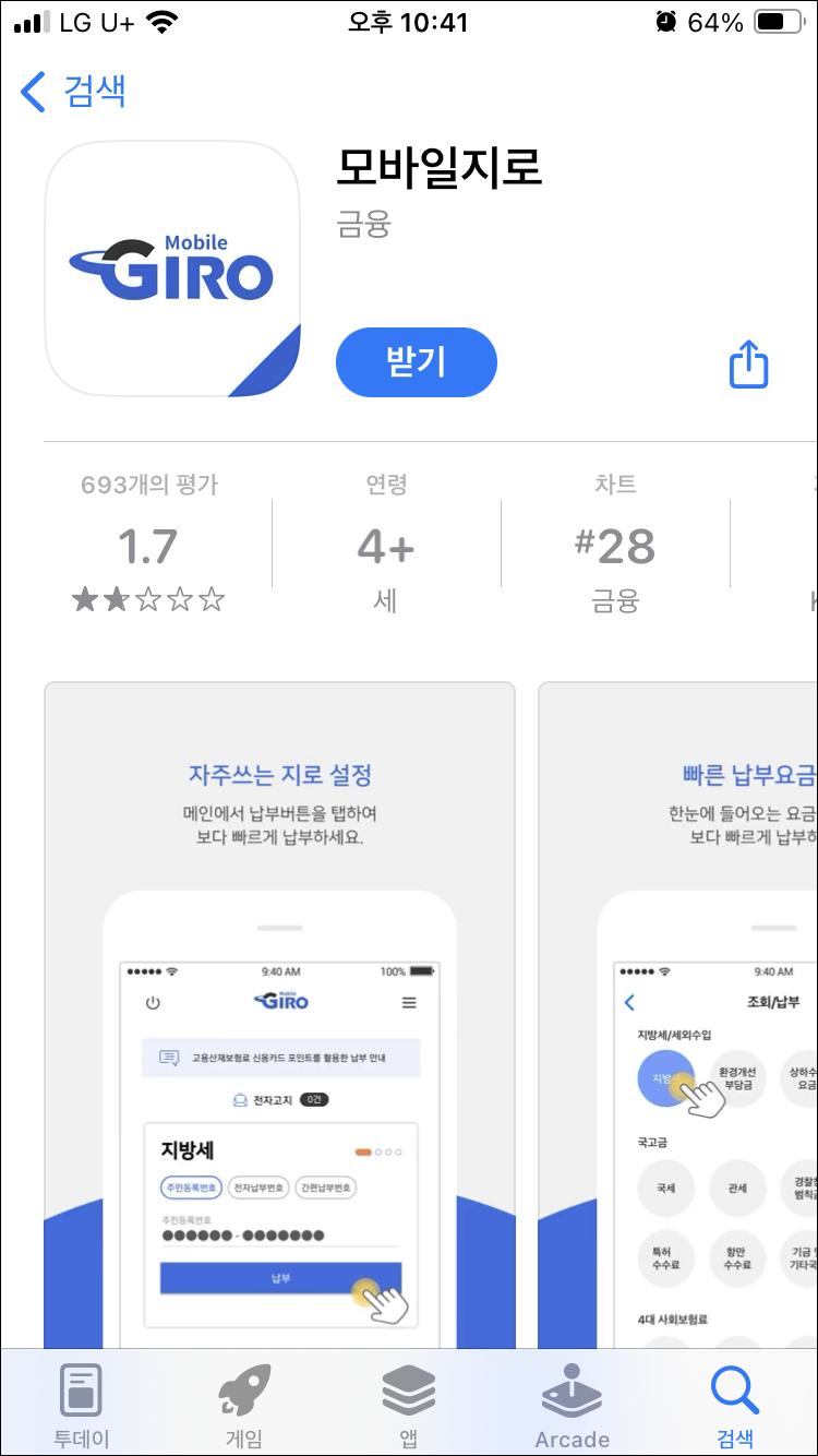 이번달부터는 더욱 편리하게 모바일 지로를 다운로드하여 공과금을 납부해 보겠습니다.