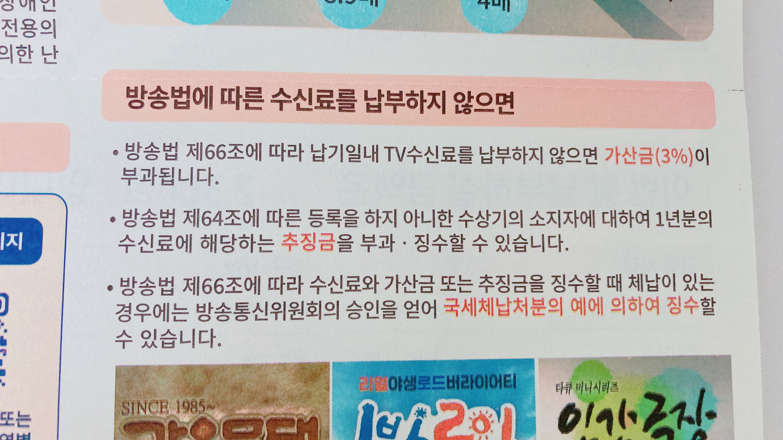 -방송법 제66조에 따라 납기일내 TV수신료를 납부하지 않으면 가산금(3%)이 부과됩니다.