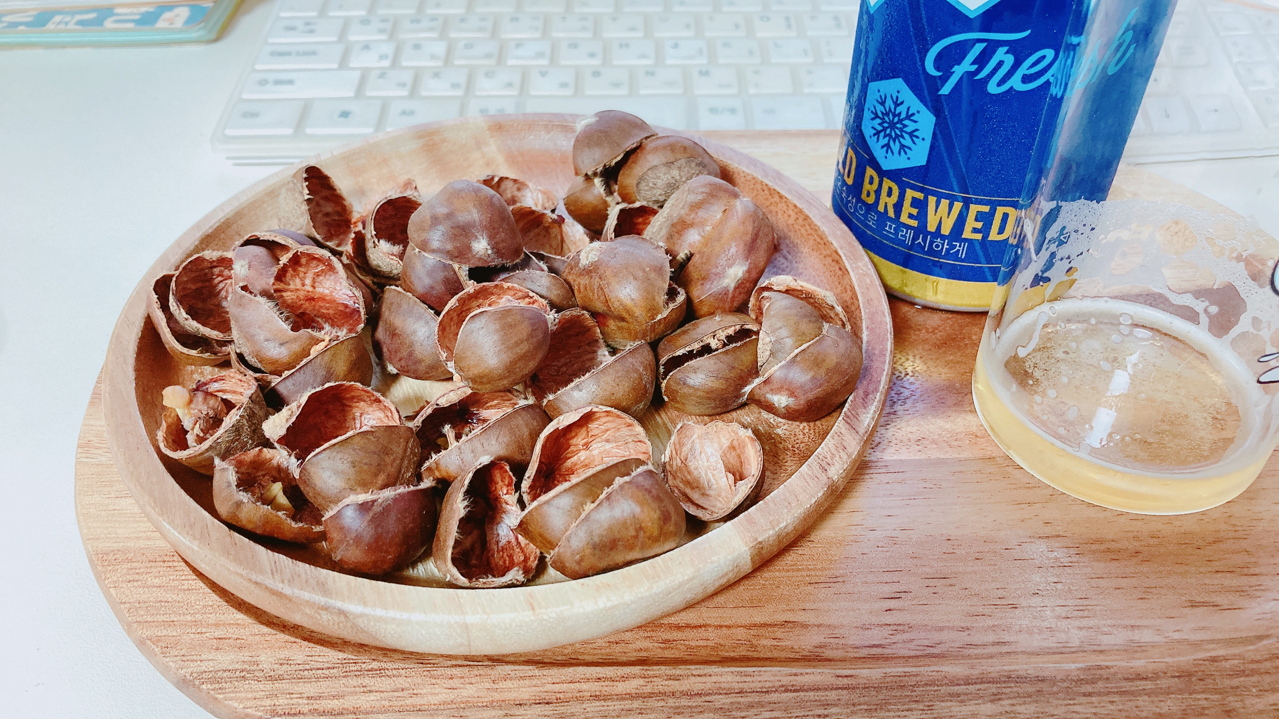 목 막히니까 시원한 맥주와 함께 신나는 군밤타임~^^