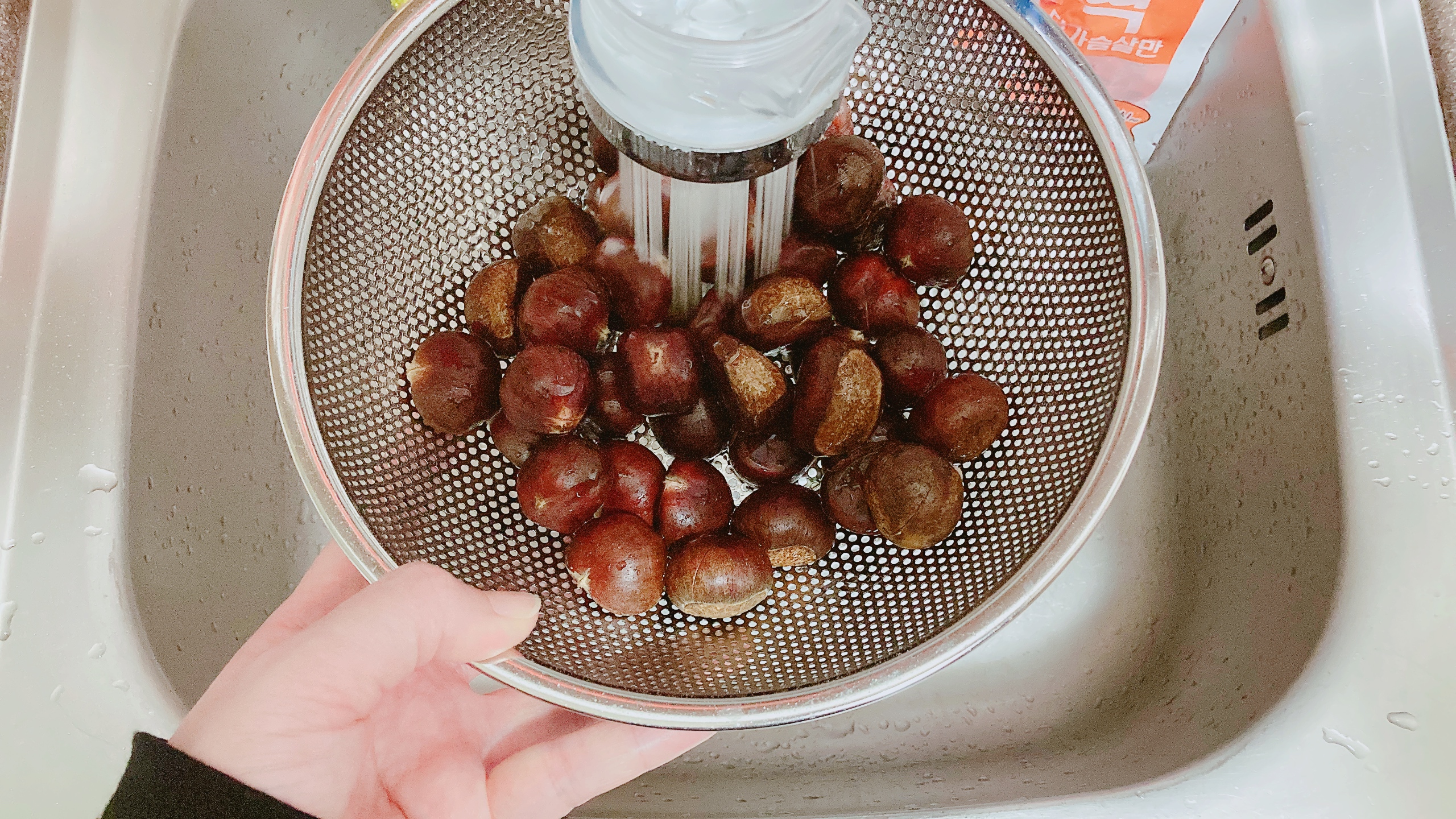 약단밤은 세척 후 칼집을 낸거라 바로 에어프라이어에 구워도 되지만 물에 잠시 담구었다 구우면 조금 더 촉촉한 약단밤을 즐길 수 있다고 해요.